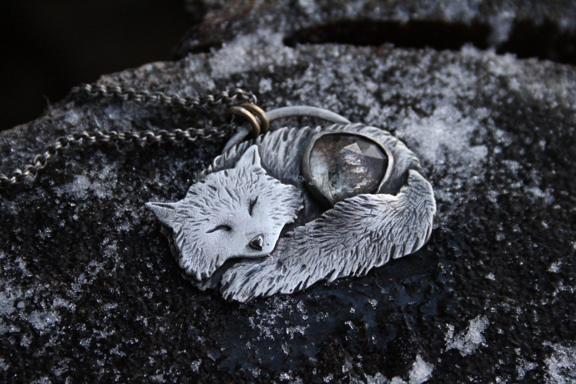 Sterling silver Arctic Fox handsawn + textured with a hammer and handmade tools. Icy moss aquamarine nestled in silver beneath his tail. Brass detail.