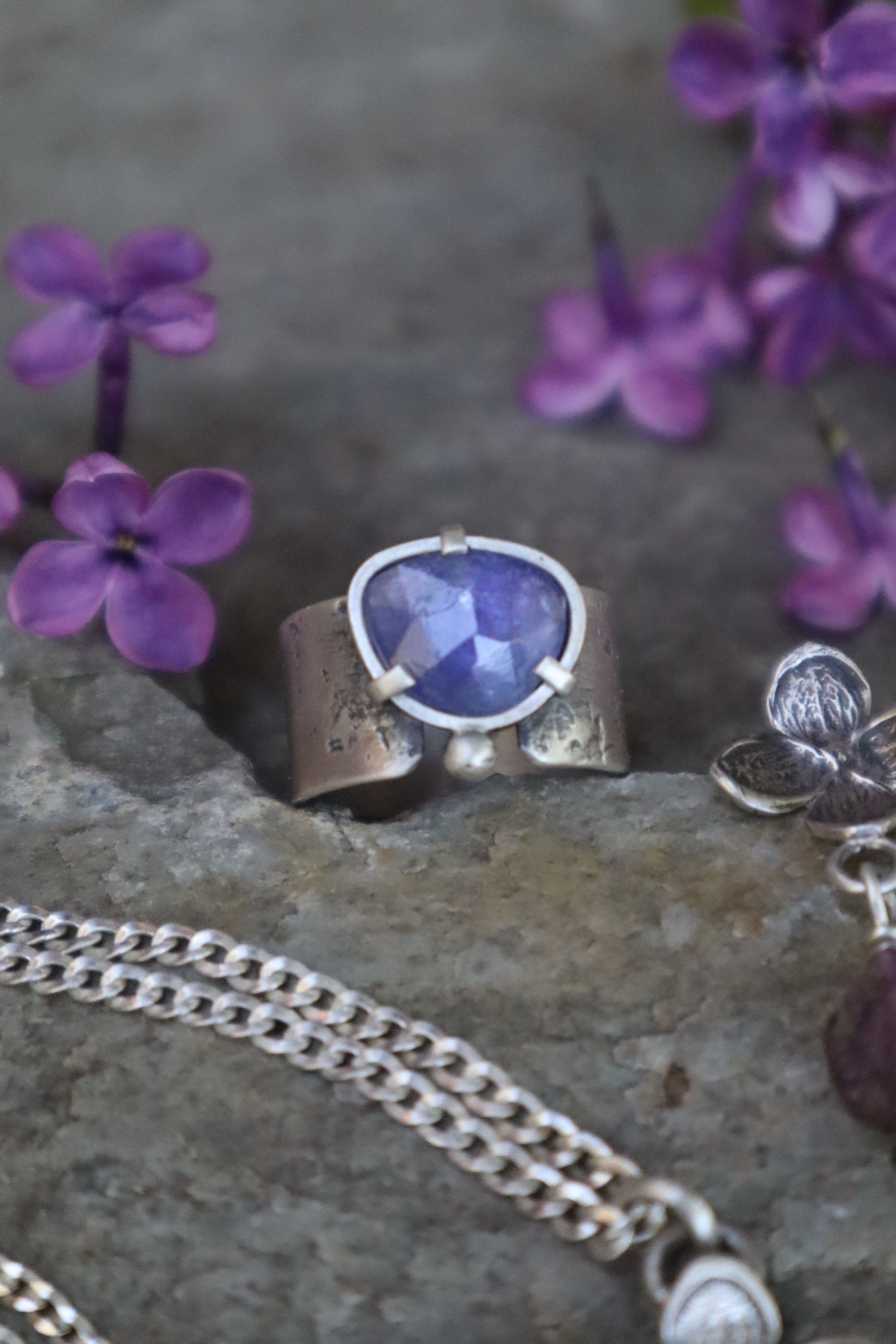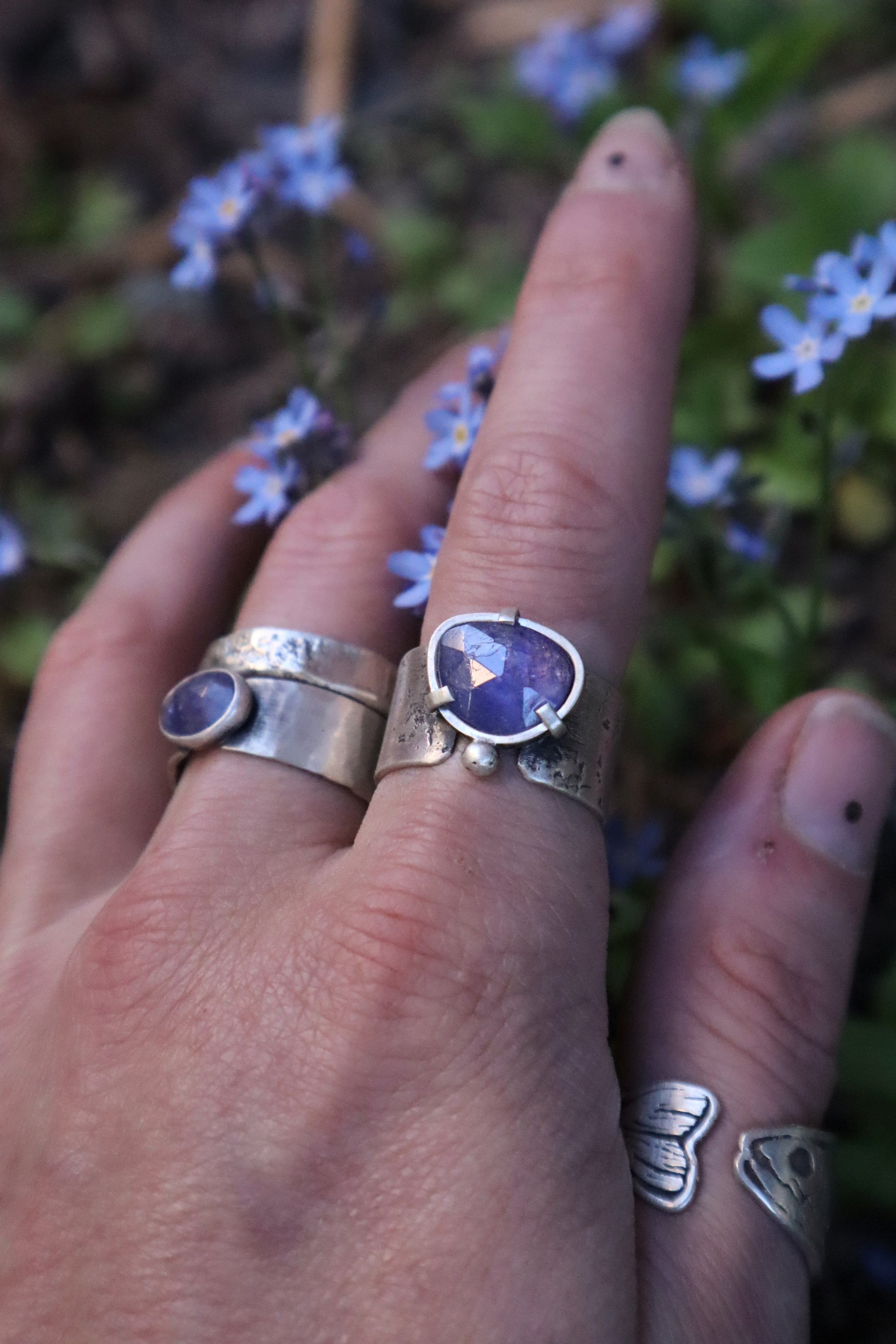 Forget Me Not Band — textured sterling silver band + rosecut tanzanite + prongs. These stones so closely mimic the color of forget me nots!