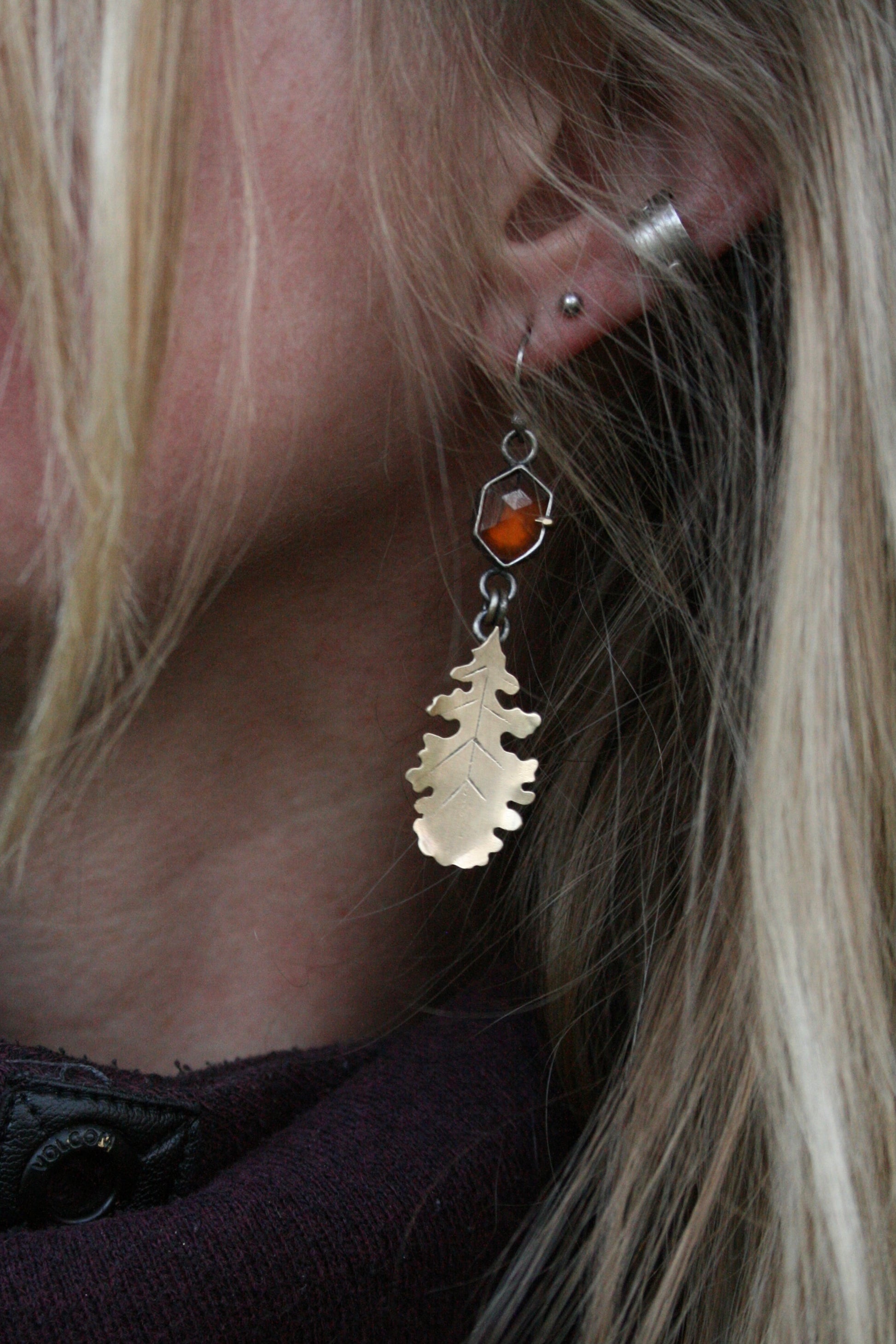 Hessonite garnet hexes. Handsawn brass mossy cap oak leaves. Silver setting + brass details. ~2.5” long from top of earwire.