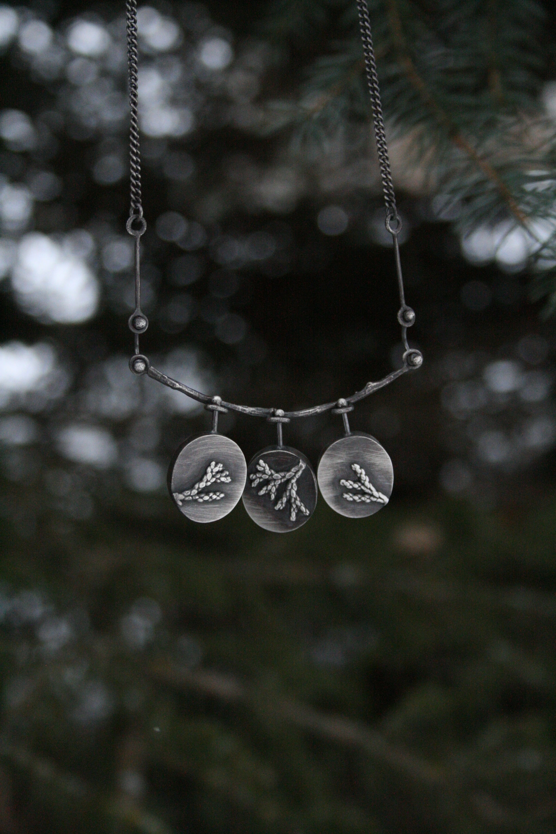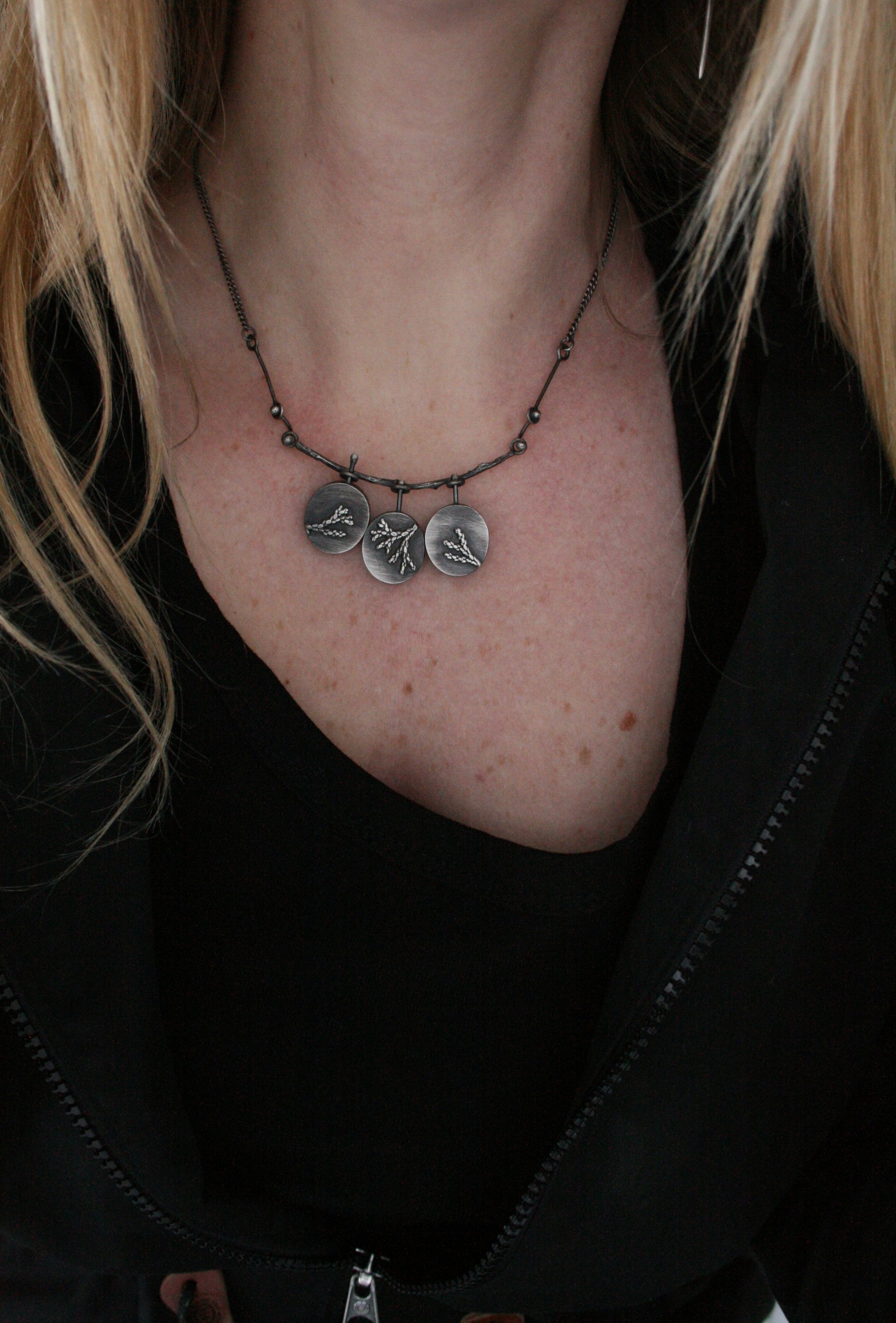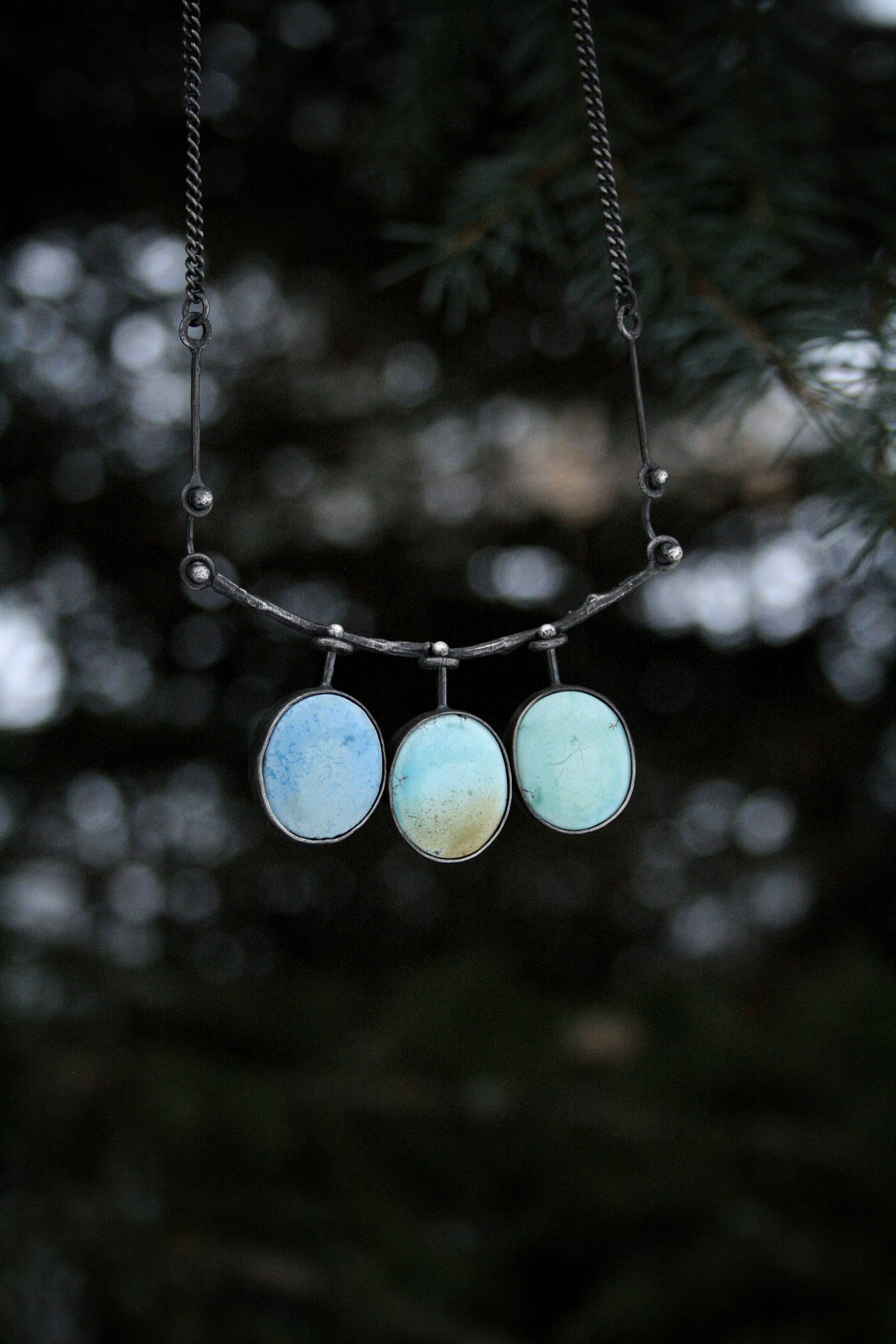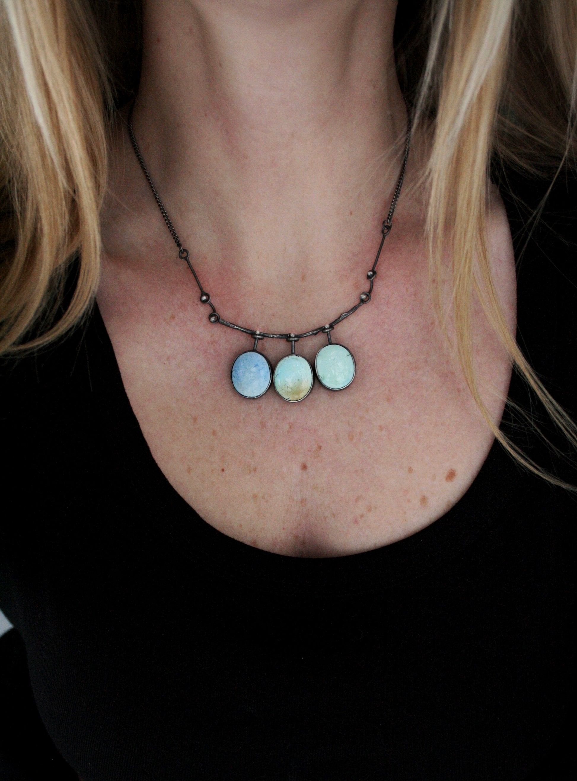 Golden Hills Turquoise. Cast twig. Cast cedar backs. Each petal is reversible. 16” chain.