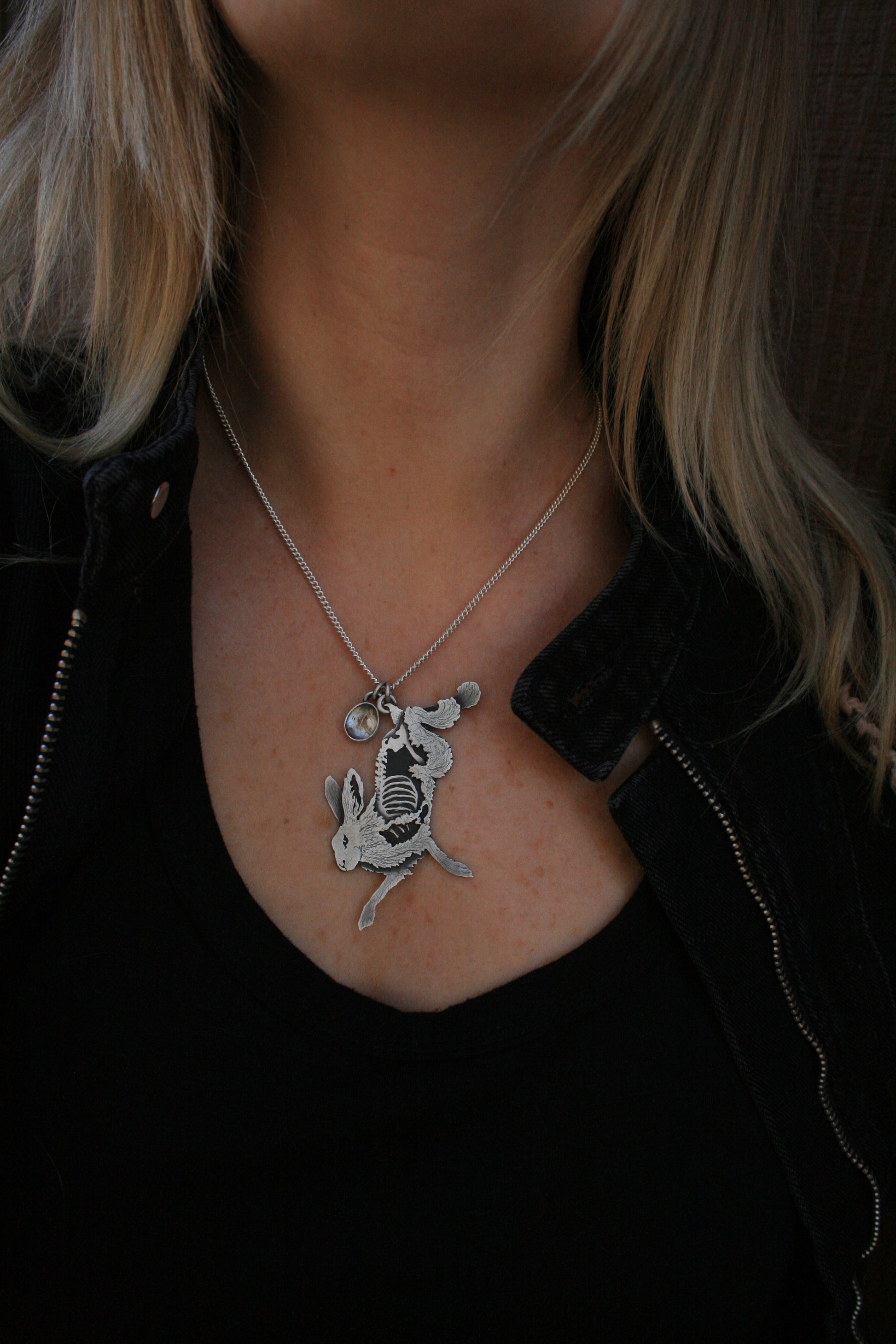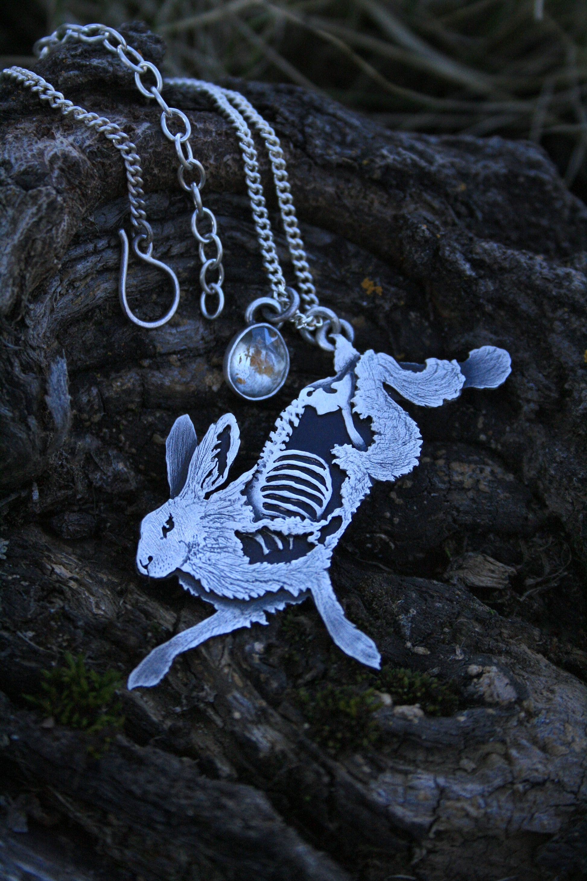 Silver + moss aquamarine — the stone has the tiniest hint of blue but mostly shines clear. Adjustable chain from 15”-18”. Hare is ~2.25” long.