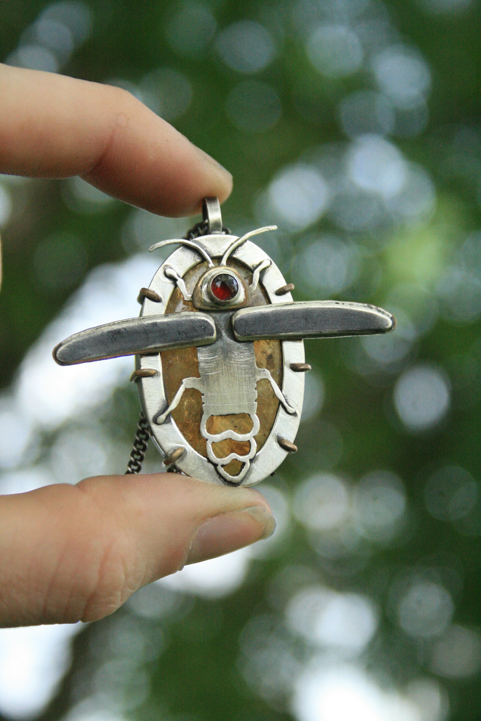 Kinetic Lightning Bug. Raw face citrine. Garnet. Silver + Brass. 16” chain with 2” extender. Measures ~ 1.6”x1”.