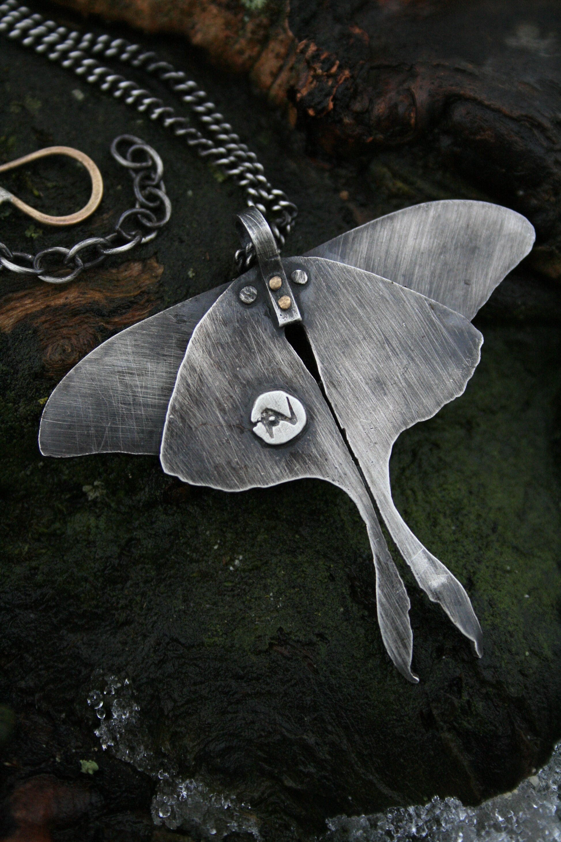 Kinetic wings. Moonstone. Brass rivets. Chain adjustable from 15”-17”. Moth measures 2.4”x2”.