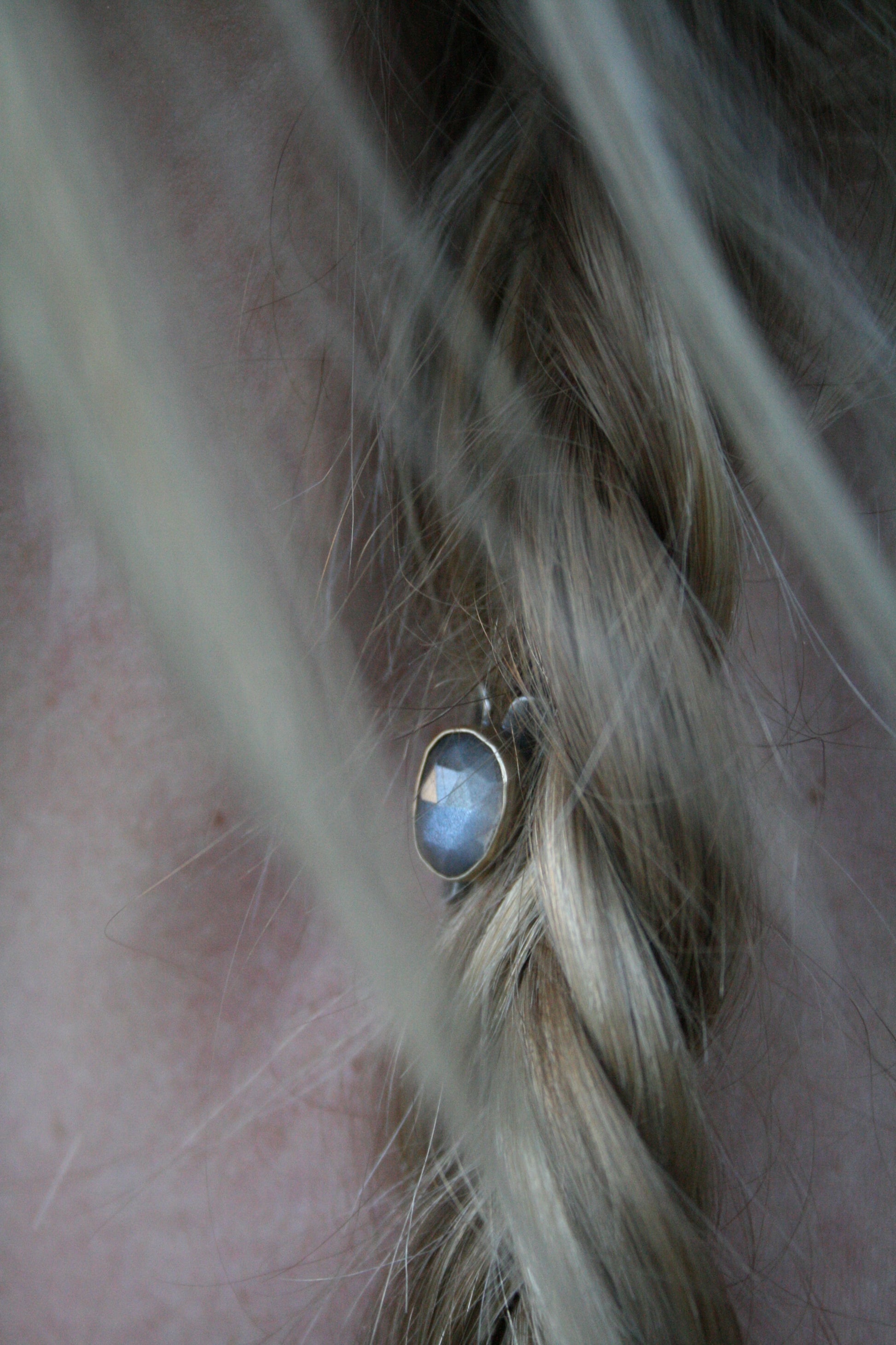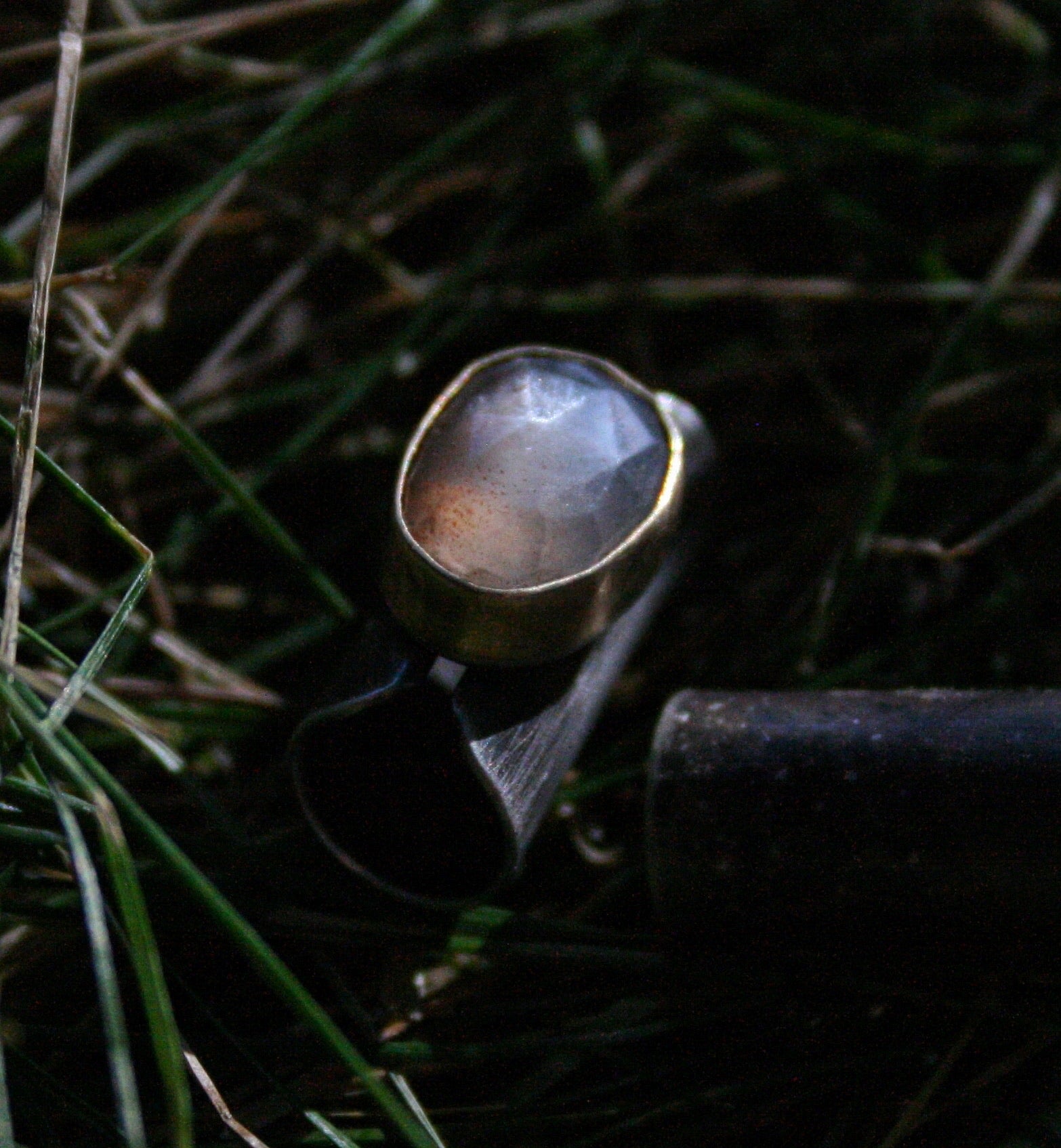 Rosecut, bicolor moonstone with hints of peach, greys, and blues set in brass
