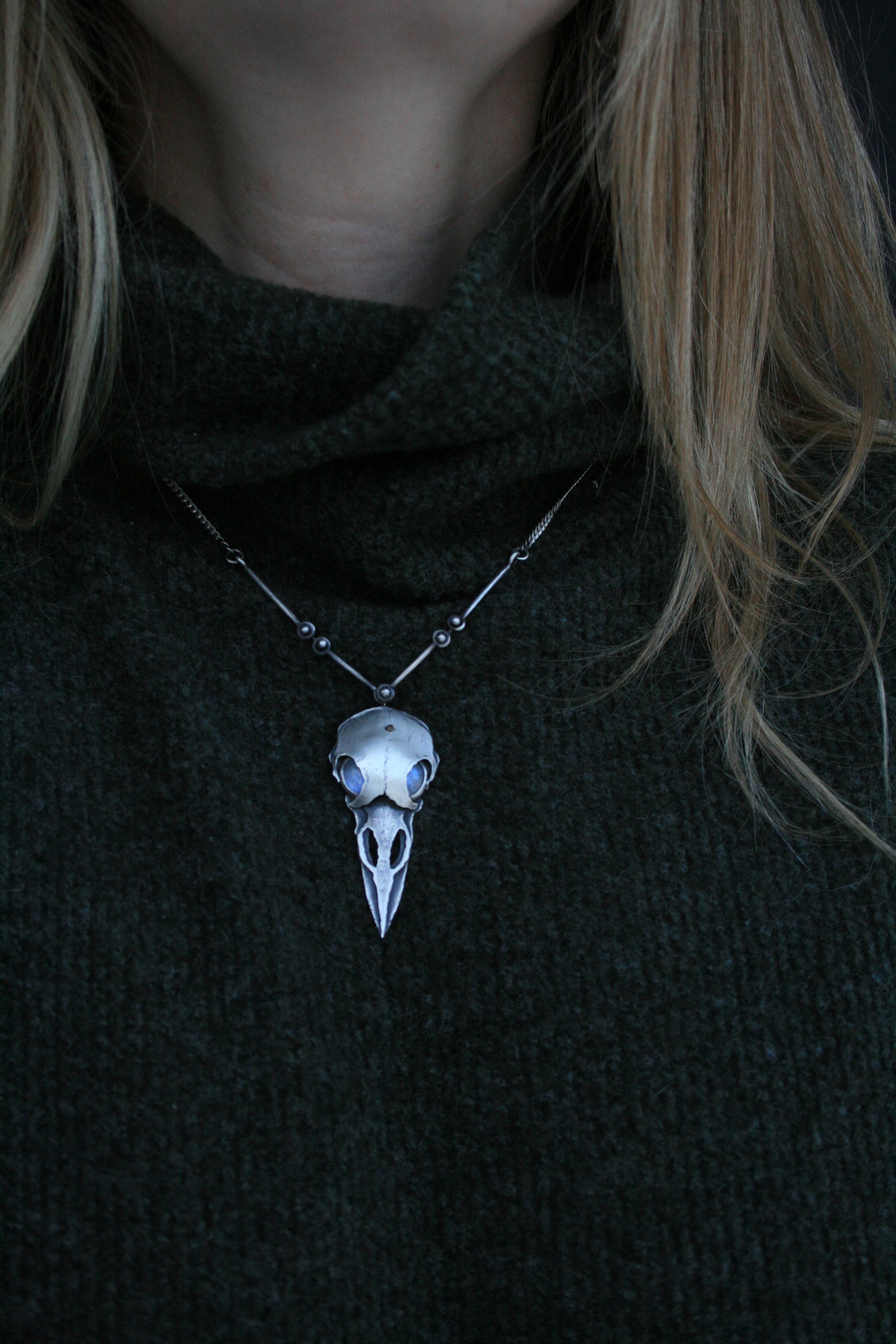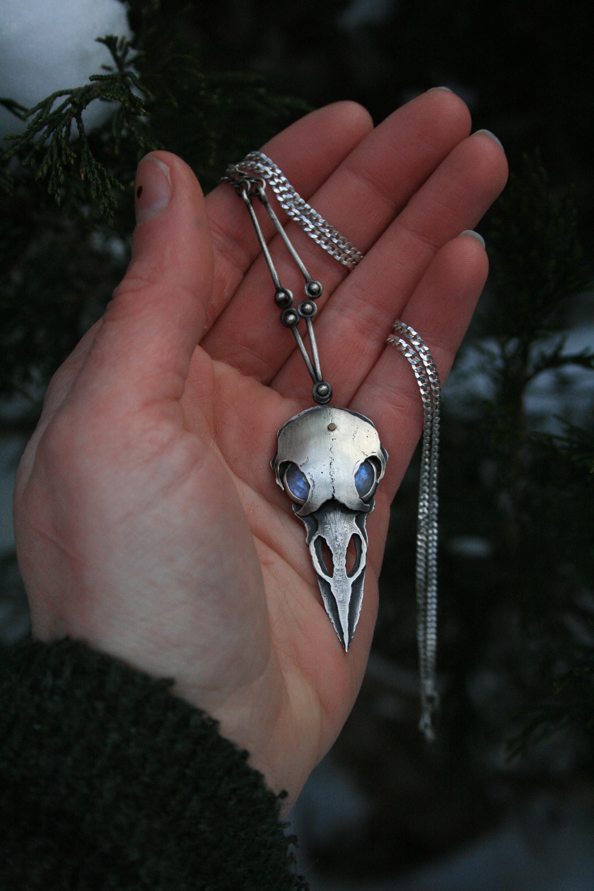 Sterling silver raven skull with moonstone eyes - another experiment in brass rivets ✨ I love this piece, the domed frontal bone took a few tries to get right but I think it really brings it to life. The chain is ~20” long - a combination of handmade ball link and flat curb chain. Raven measures 2” long.