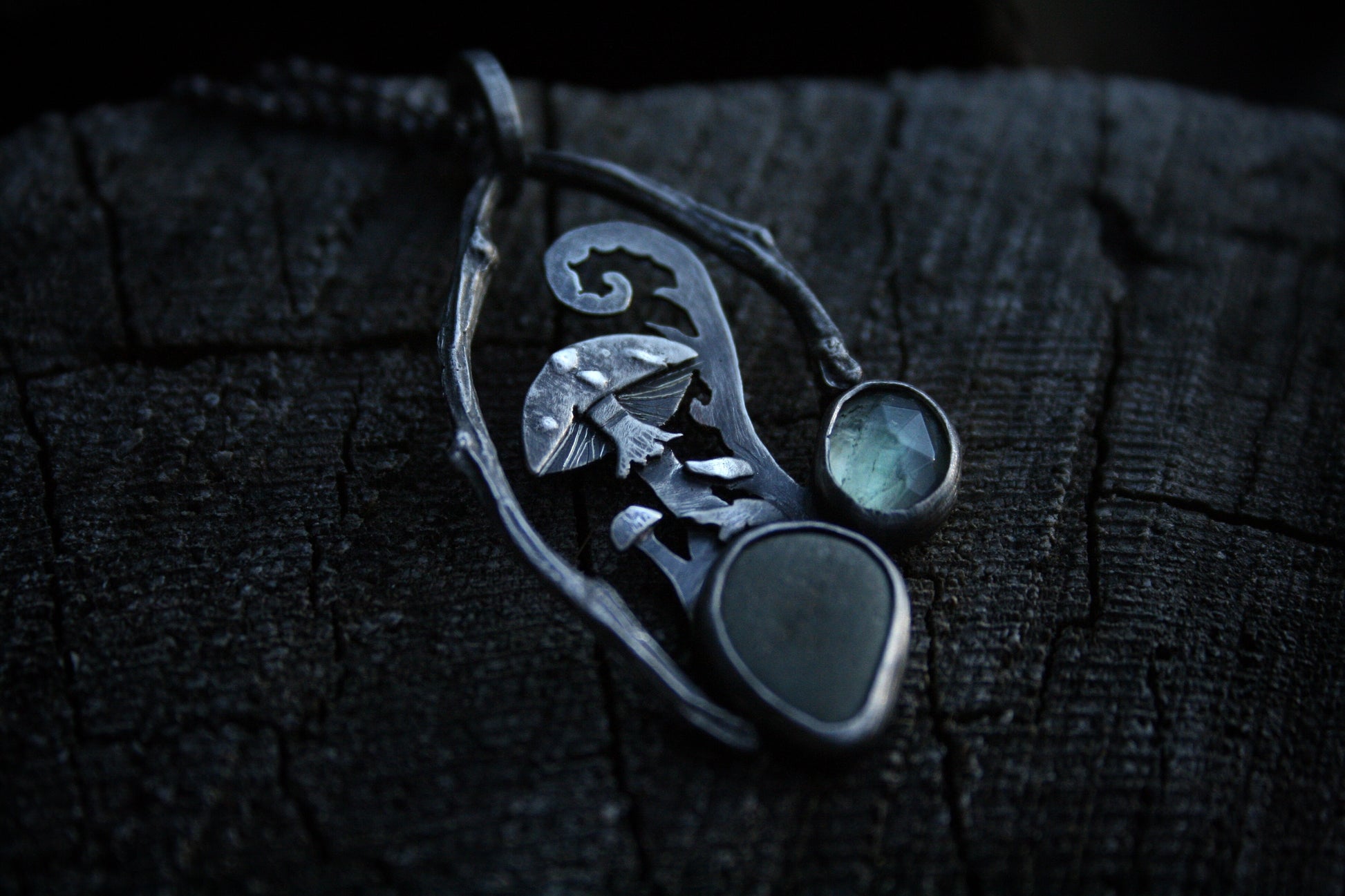 Mushrooms + fiddleheads. Montana River stone + fluorite. Cast twigs. Sterling + fine silver. ~1.85” x 0.85”. 18” chain but adjustable to any length.