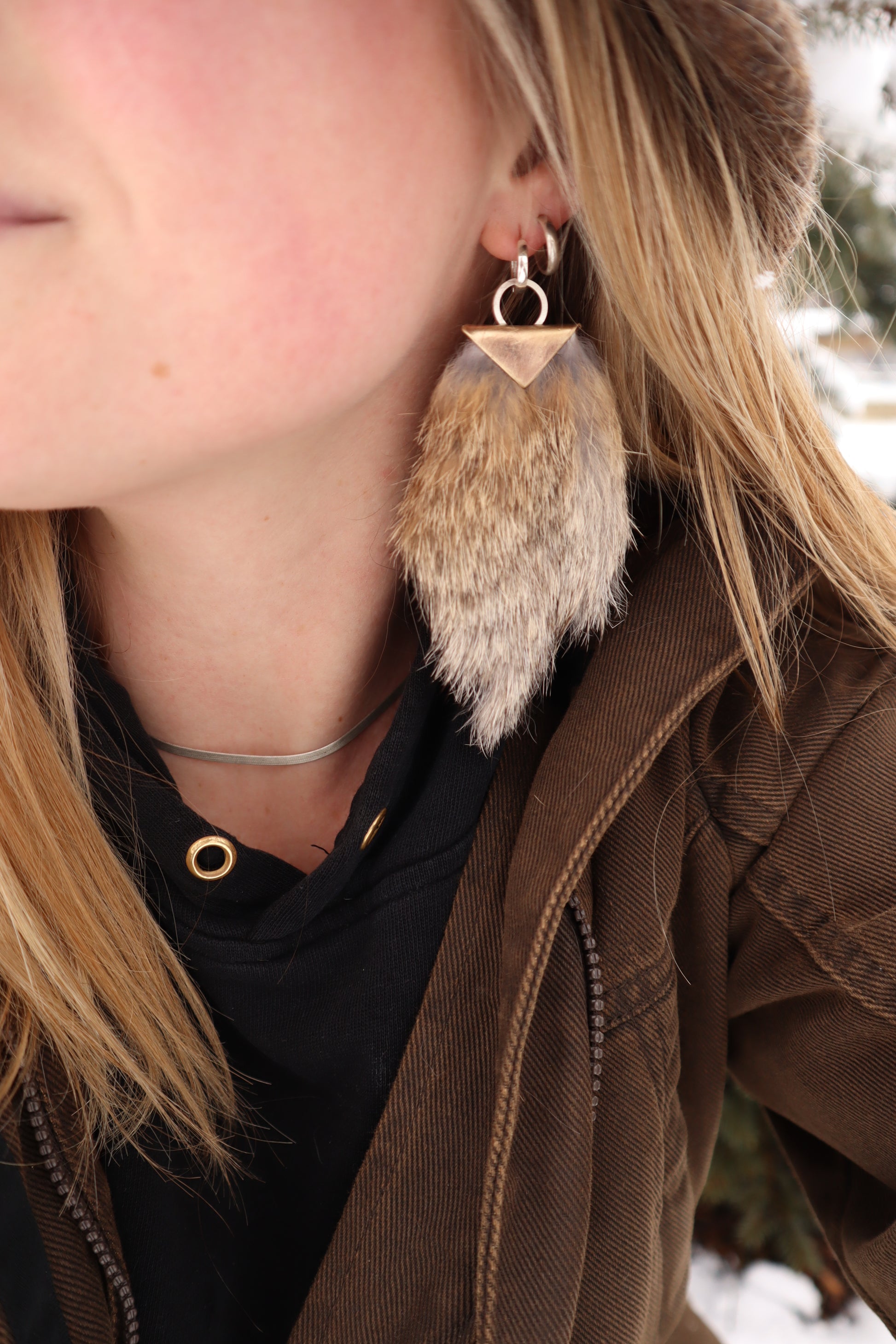 Real rabbit fur, brass crimp + silver hoops