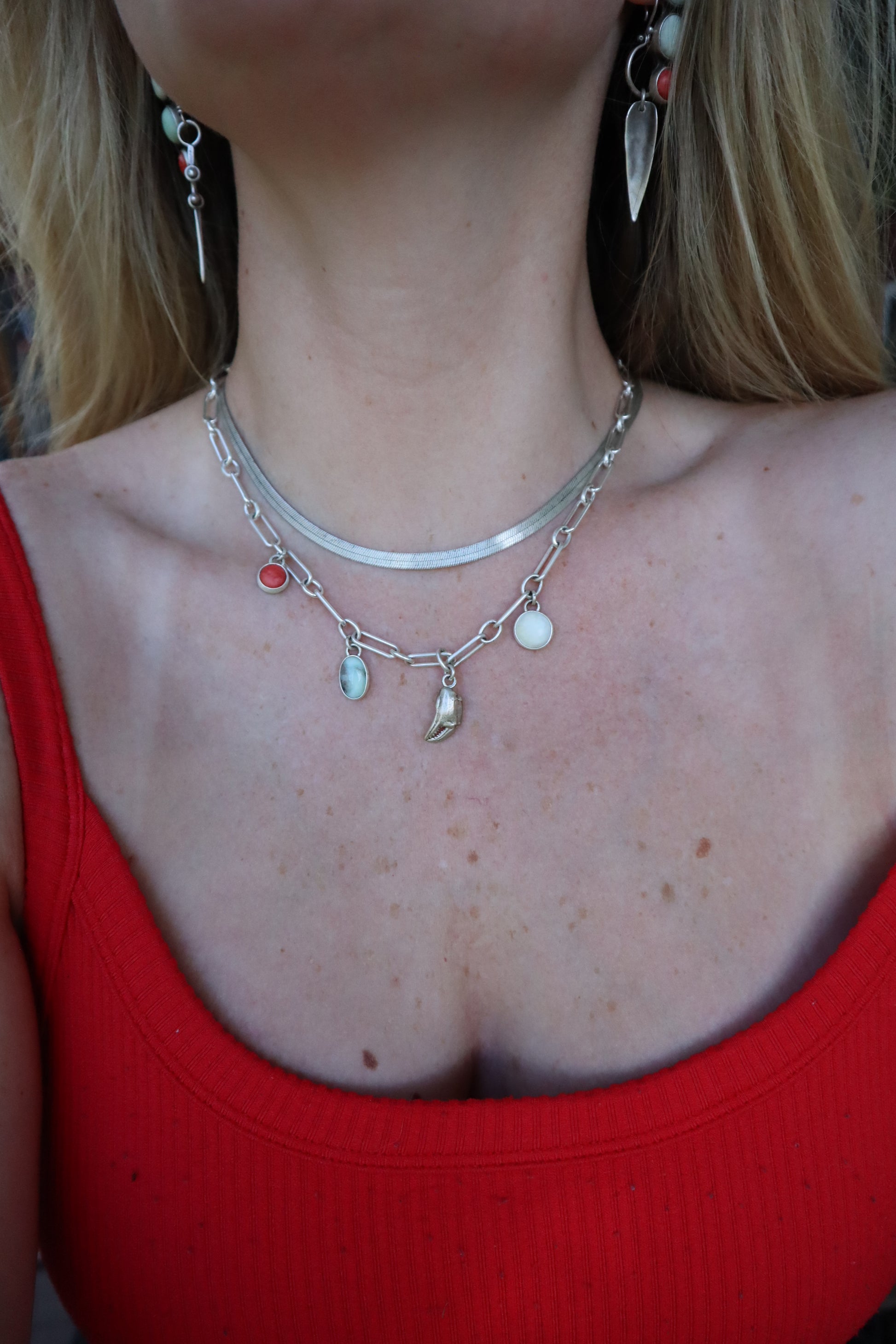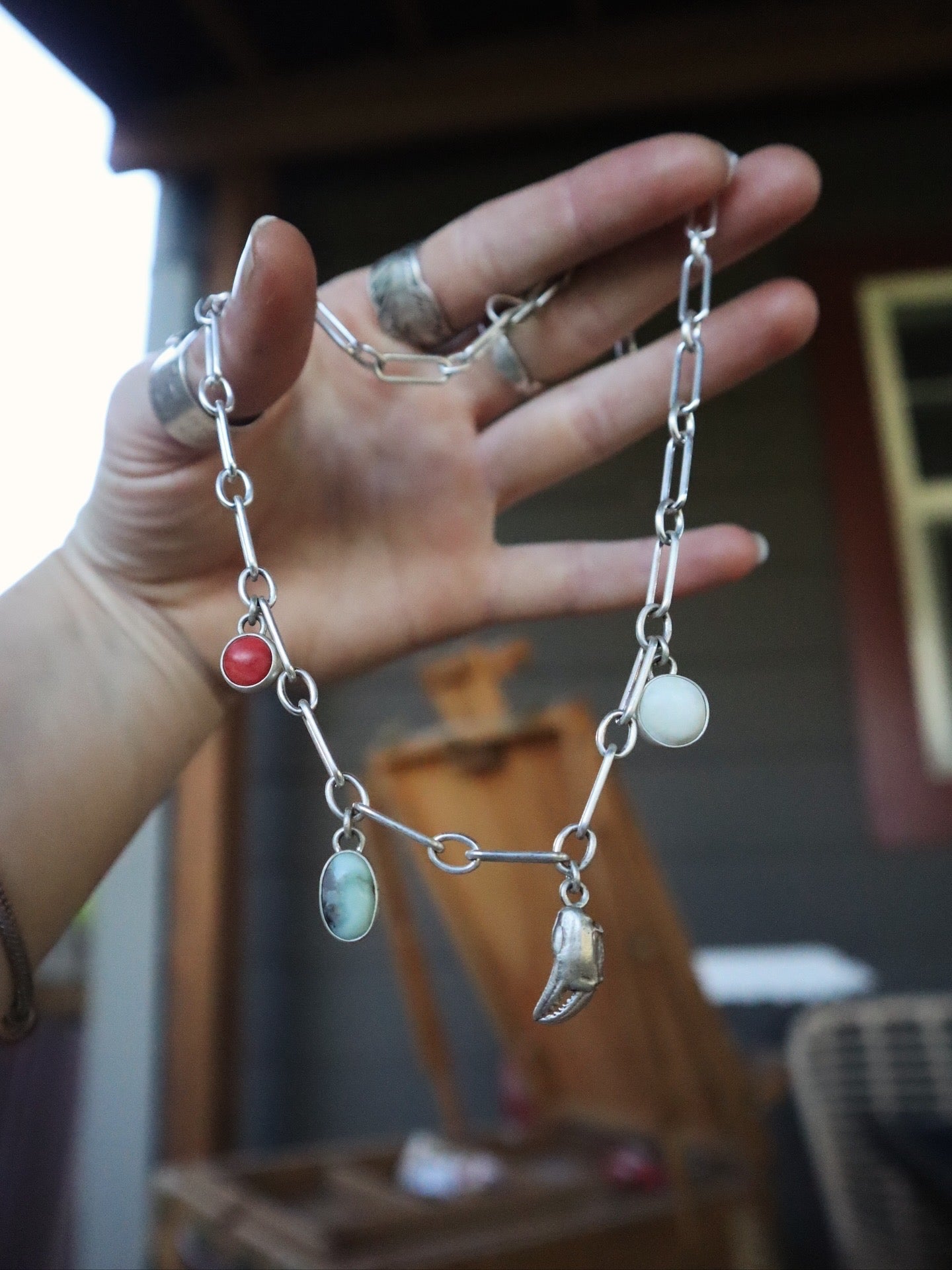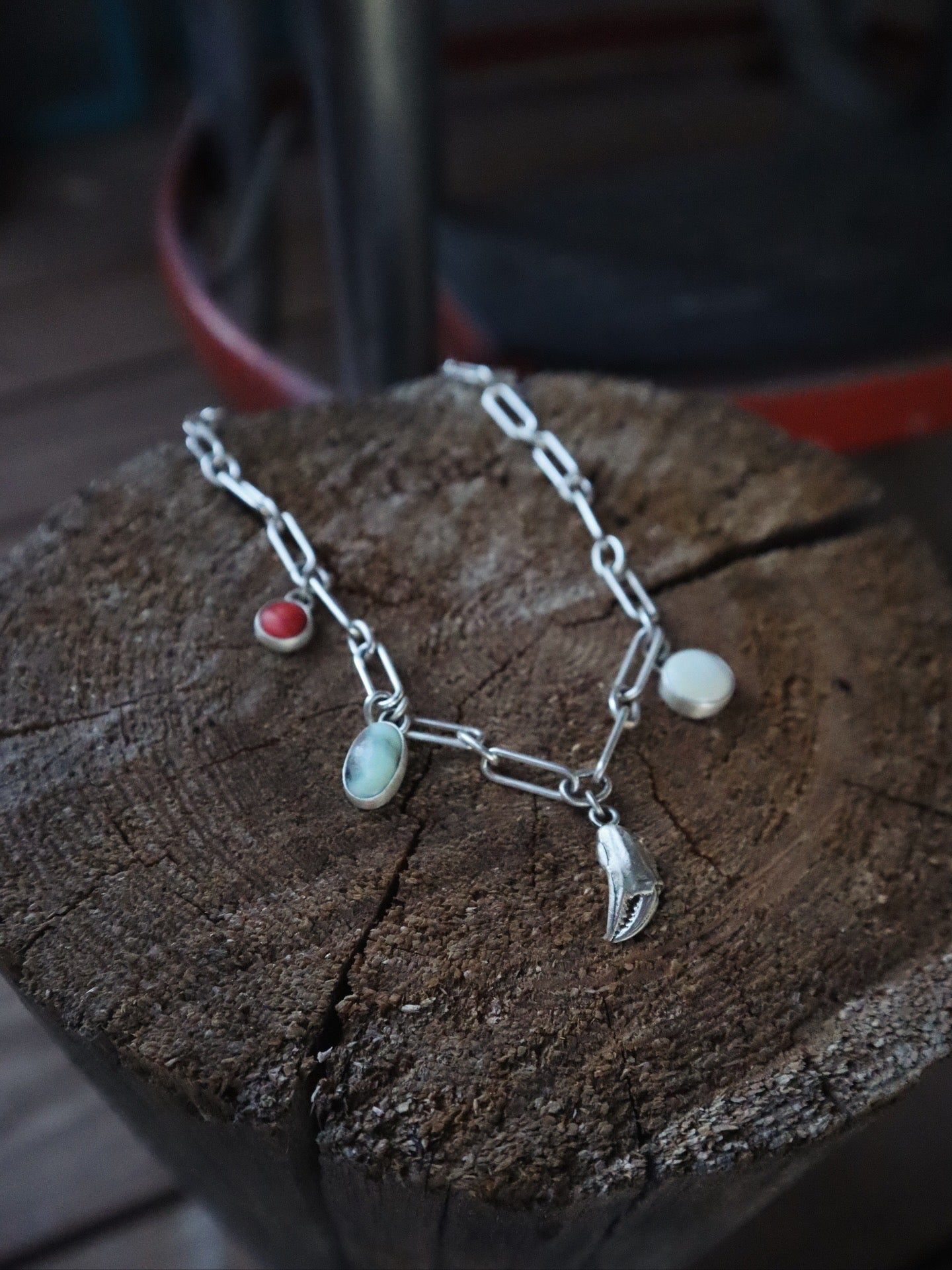 My very first charm necklace!? Spiny oyster + Paloma turquoise + cast crab claw + ivory creek Variscite on a chunky sterling silver chain. Adjustable from 15”-16”. I love her! 🦀