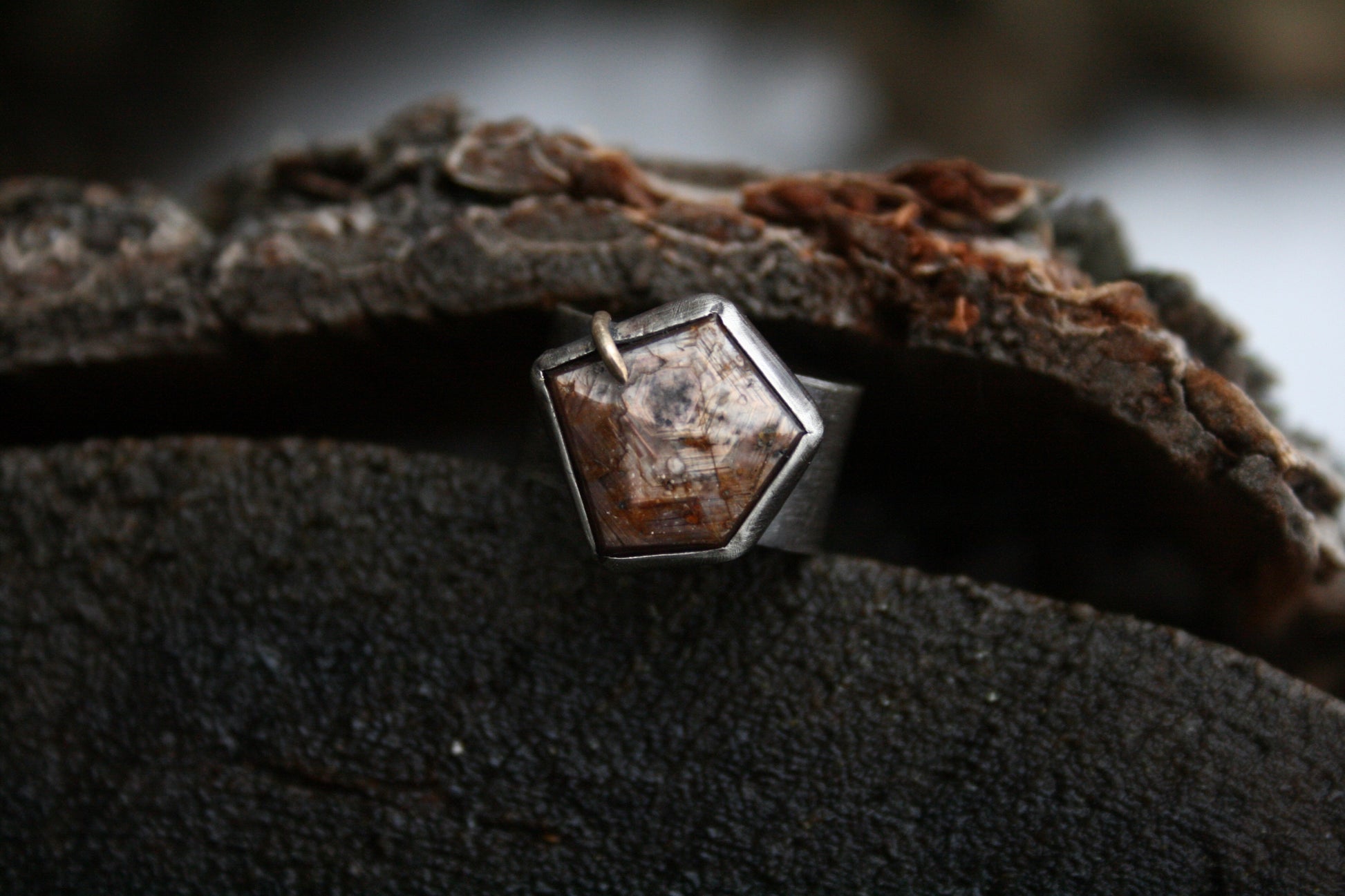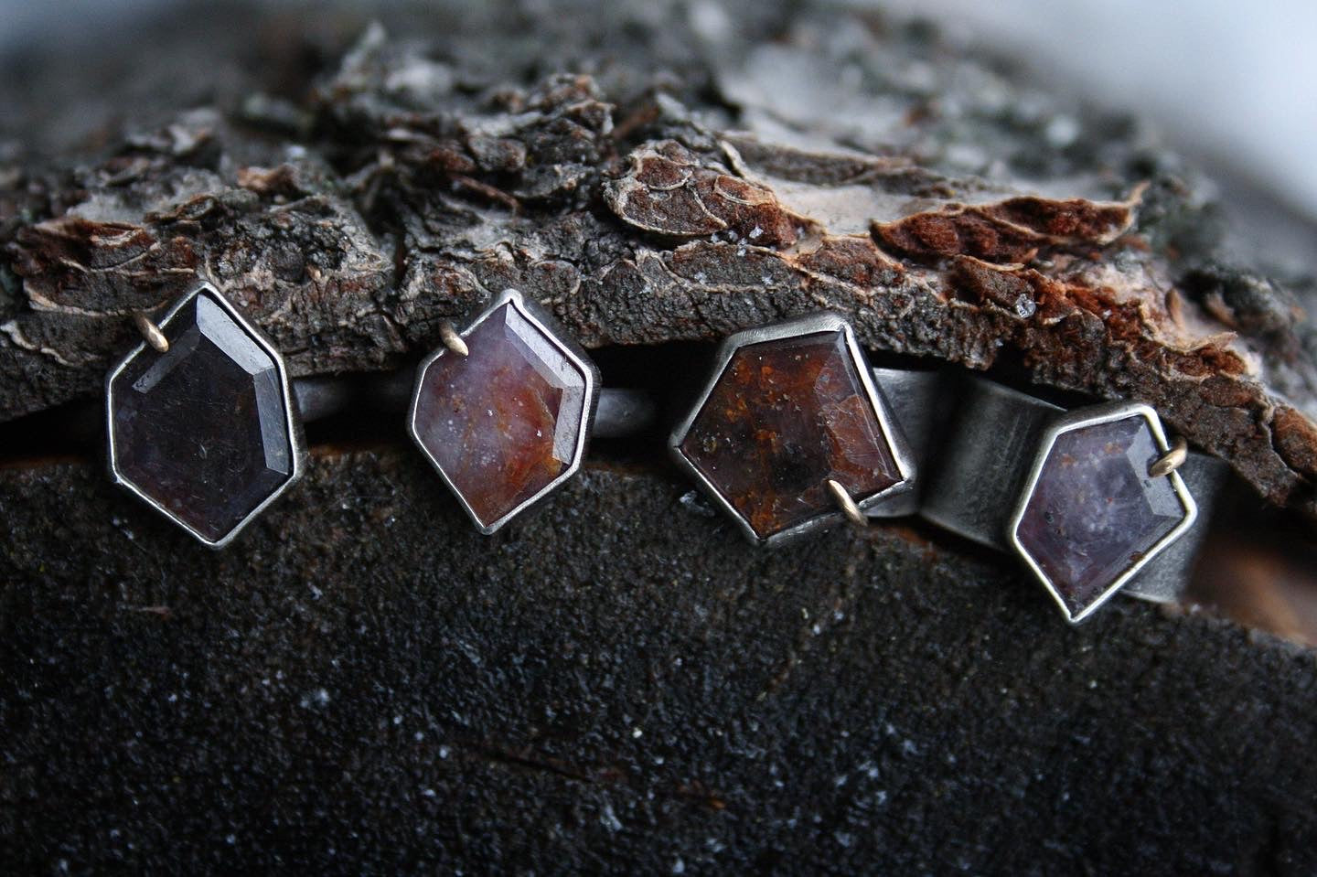 Geometric sheen sapphire set in sterling + brass claw. View all photos for color change and sheen.