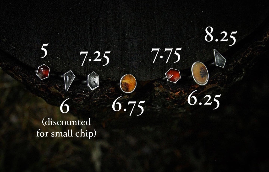 Silver. Autumn-hued dendritic agate. Tourmalinated quartz. Hessonite garnet. Sizes from L-R: 5, 6 (discounted for small chip in stone), 7.25, 6.75, 7.75, 6.25, 8.25. All can be sized up a half size.
