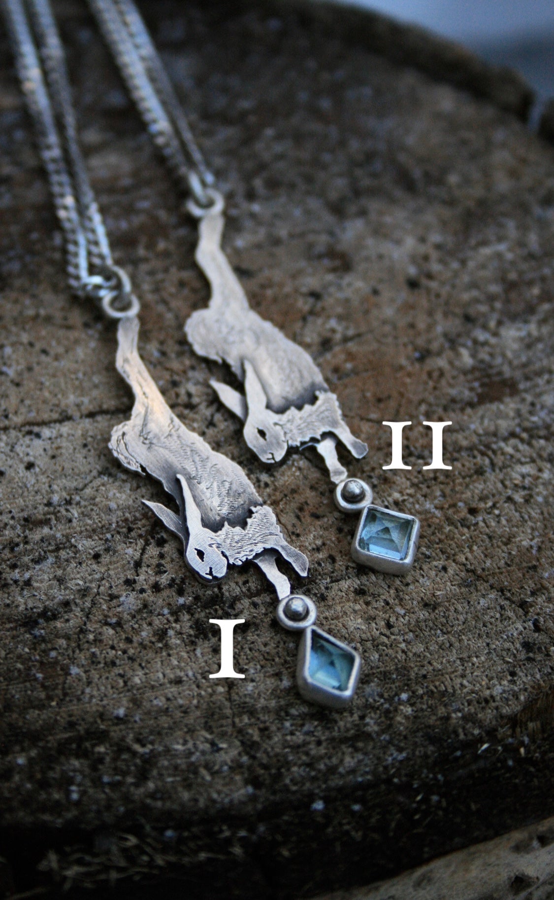 Handcut and textured sterling silver snowshoe hare. Icy, blue tourmaline dripping from their paws. Flat curb chain adjustable from 16”-18”. A little luckier than their earring counterparts 🐇