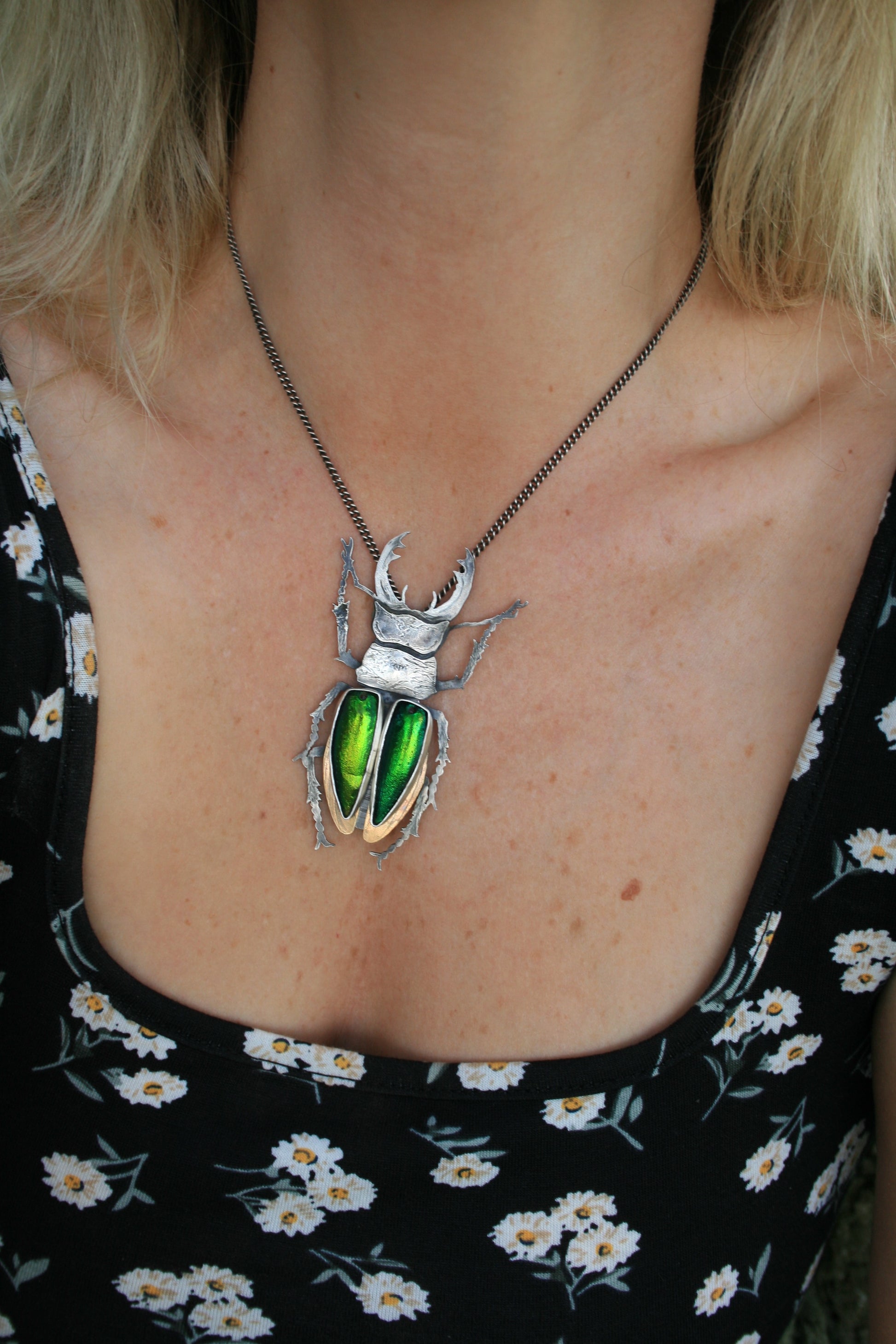 Handsawn and detailed. Silver + brass. Kinetic wings. Real jewel beetle elytra. This was a fun one! One of the larger pieces I’ve made to date, she’s about 3” long.