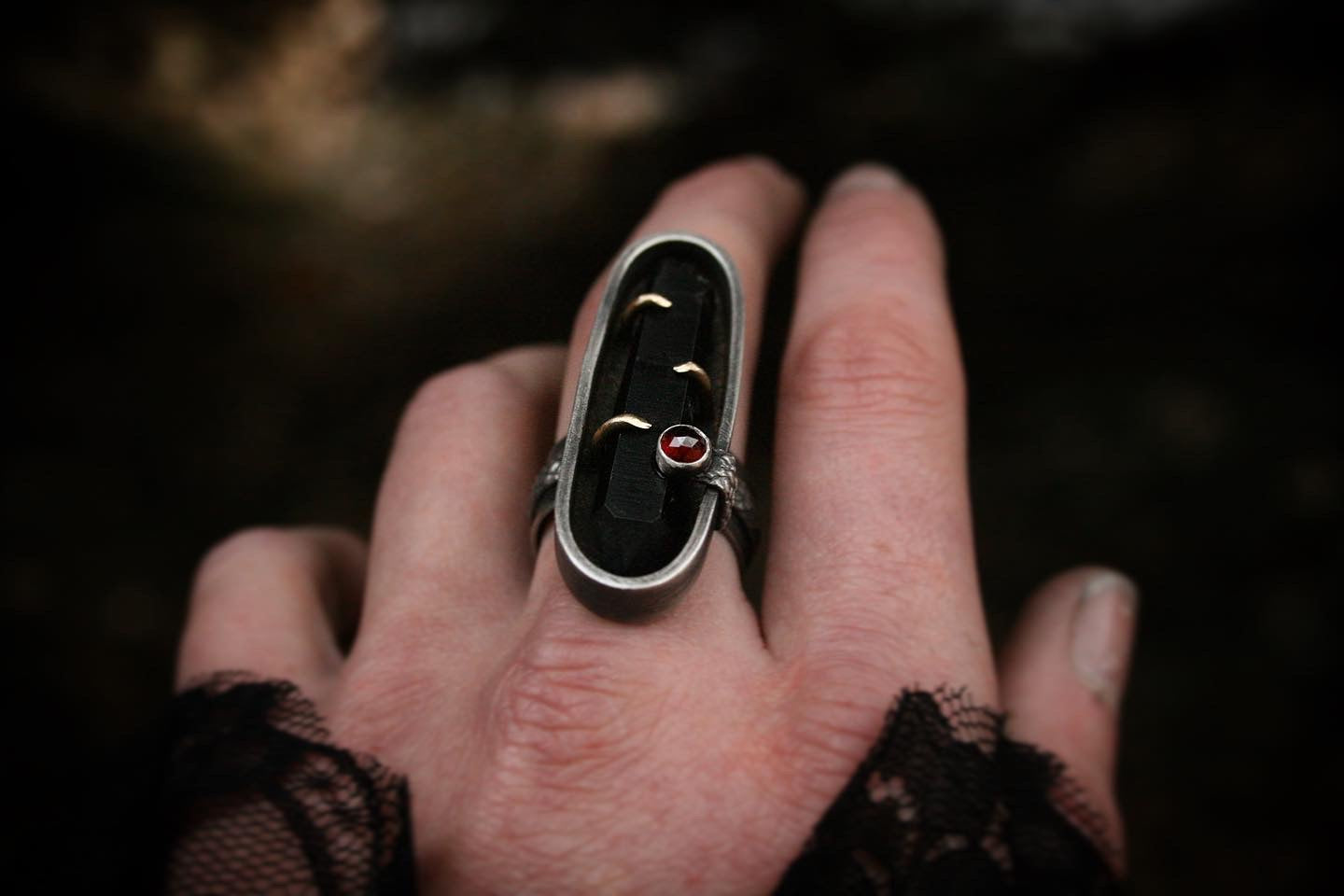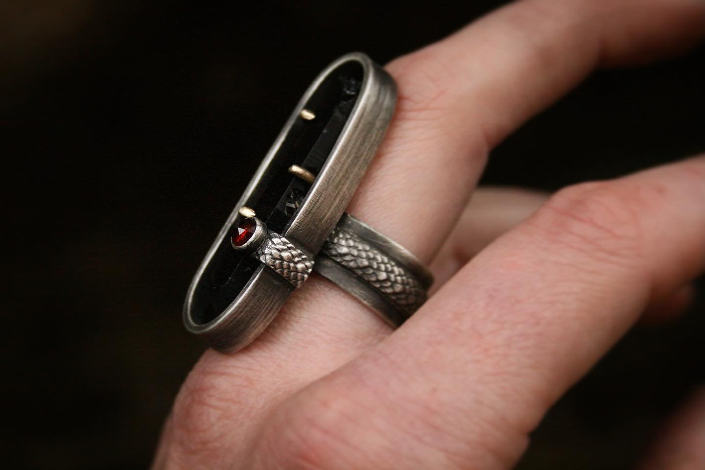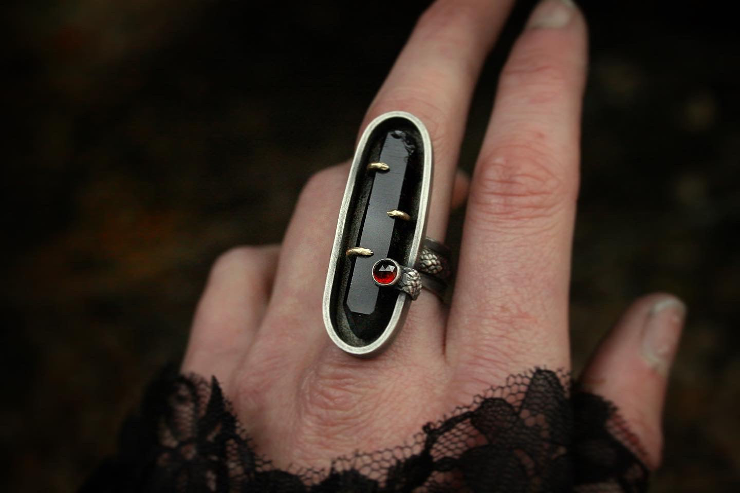Black smoky quartz crystal. Hessonite garnet. Dragon skin. Silver + brass. Best fits a size 8, give or take.