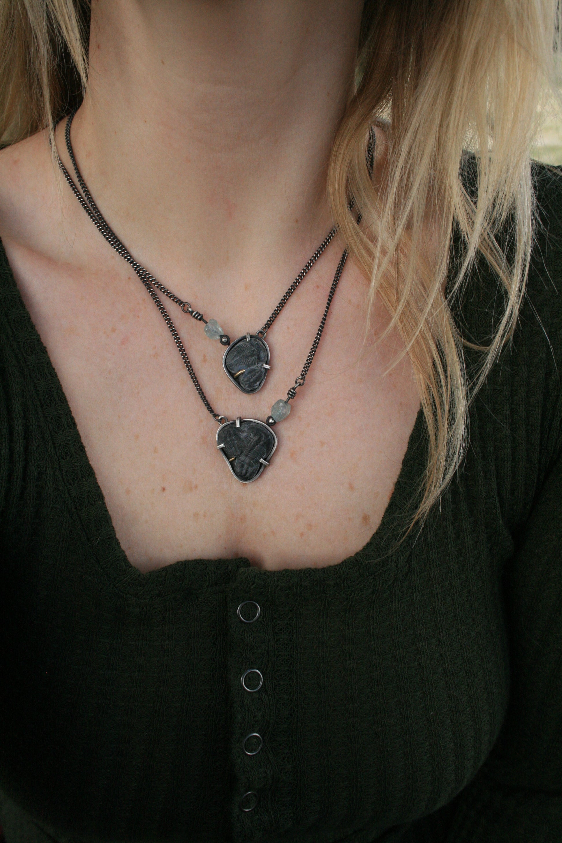 Duo and trio trilobite fossils. Raw aquamarine. Silver + brass. Chains adjustable from 16”-18”.