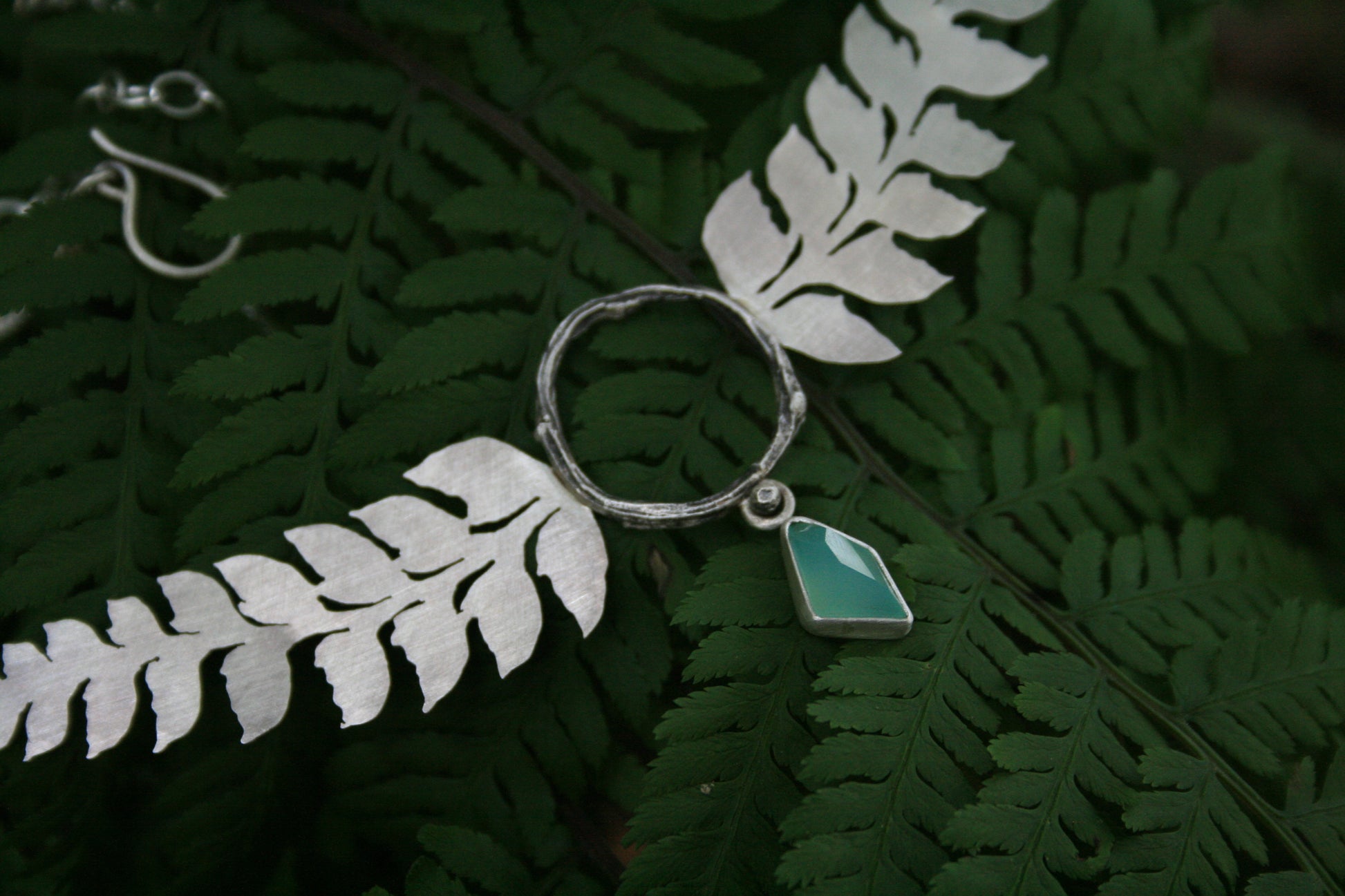 Fern + Chrysoprase // cast twig center ring & handcut sterling silver unfurling ferns. I used 24 gauge for the ferns to keep them slightly flexible and not so rigid across your chest. This piece is adjustable from 18”-21” and the fern portion measures 5.5”. I think it’s super flattering worn just below your collar bones!
