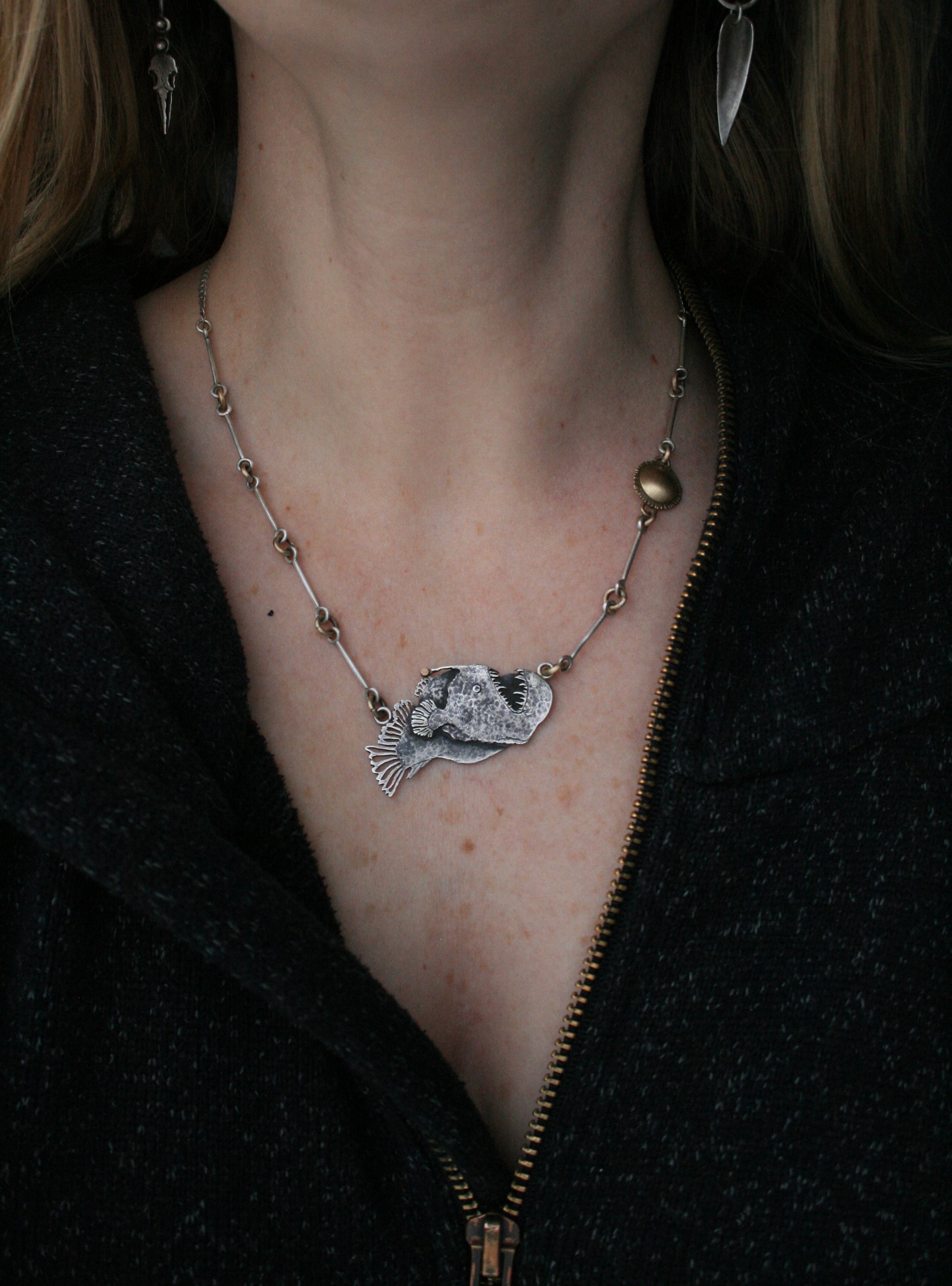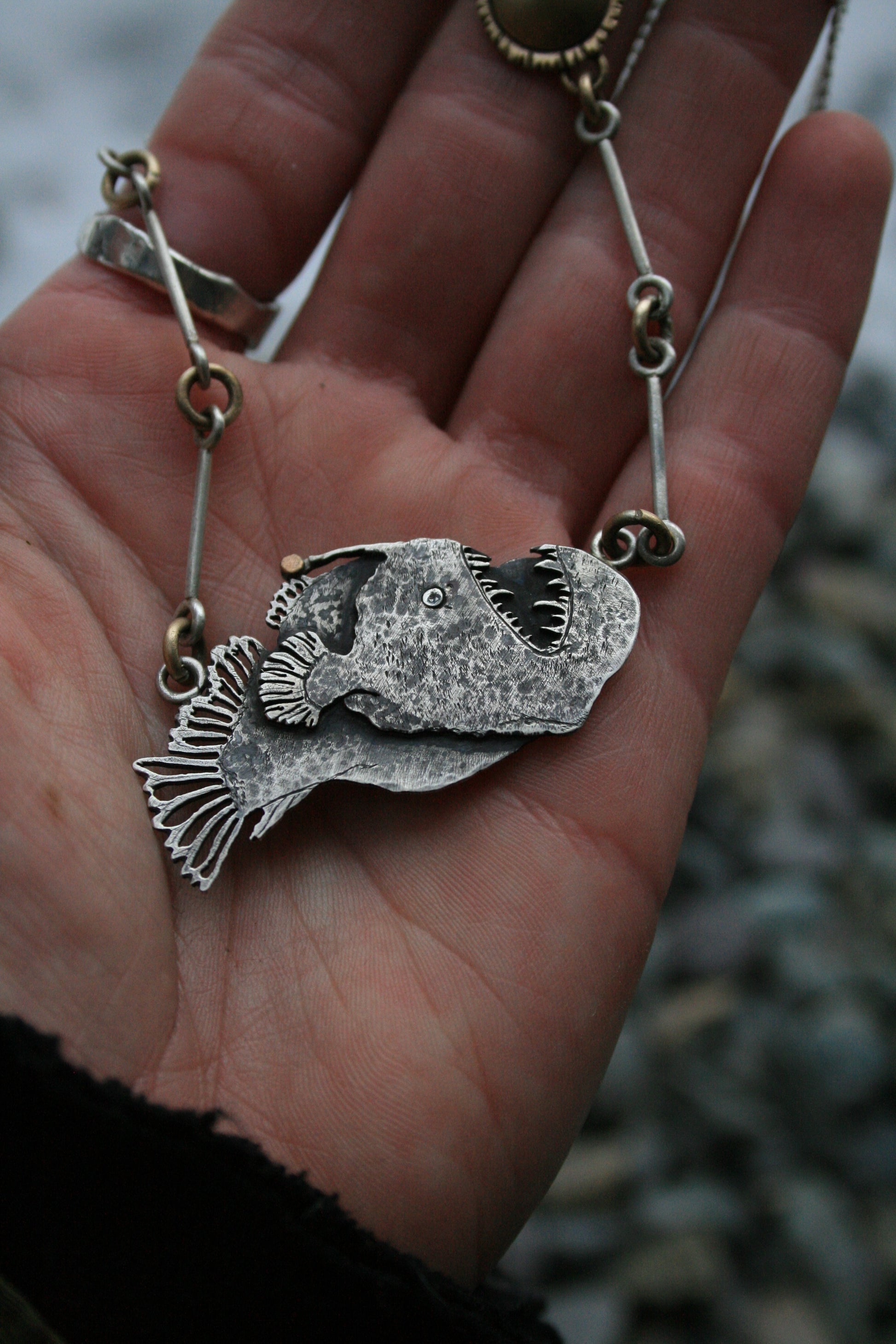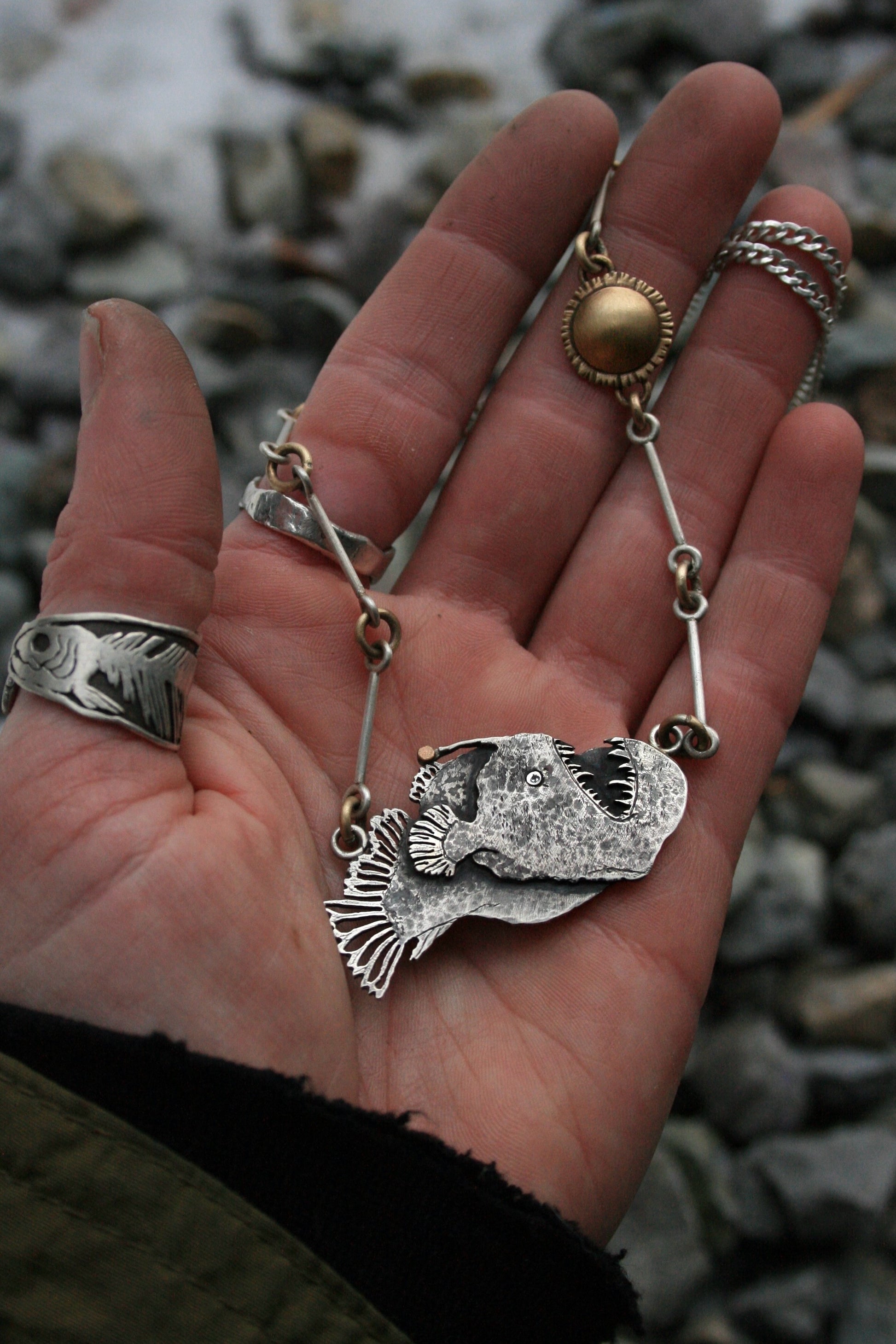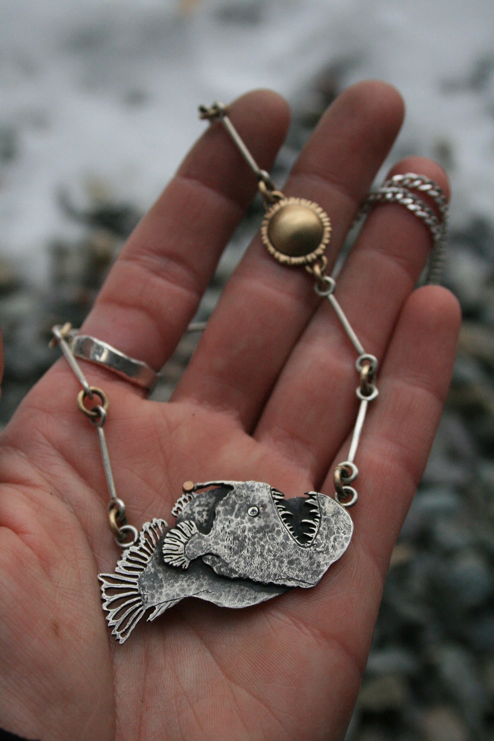 Anyway — Handcut sterling silver anglerfish swimming to a brass sun on a handmade, adjustable 16”-18” chain ☀️